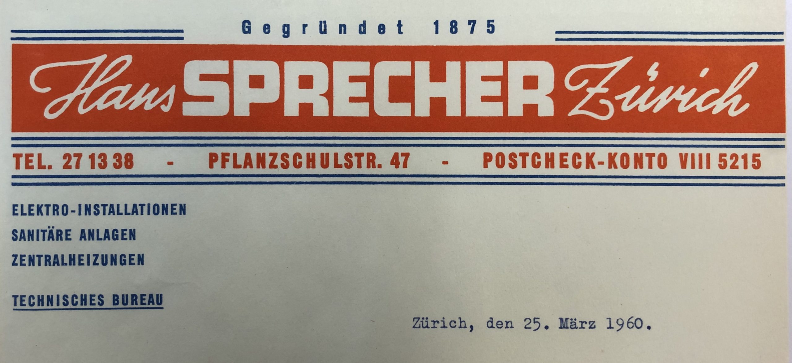 125-Jahre-Jubiläum! Die Firmen Sprecher+CO. AG, Ing. Sprecher Heizungen AG und Sprecher Sanitär AG befinden sich nach wie vor unter demselben Dach an der Pflanzschulstrasse 47 in Zürich. Die Firmen werden unabhängig voneinander geführt, stehen aber in partnerschaftlichem Verhältnis.